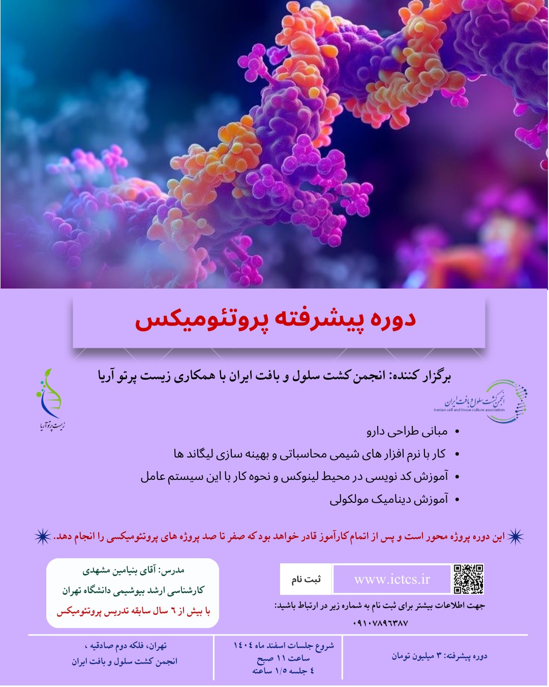(پروژهمحور – ویژه علاقهمندان تحلیلهای عمیق و دیتای واقعی) برگزارکننده: انجمن کشت سلول و بافت ایران، با همکاری زیست پرتو آریا و BICL -مدرس: آقای بنیامین مشهدی (متخصص آنالیزهای محاسباتی و دینامیک مولکولی – University of Tehran)